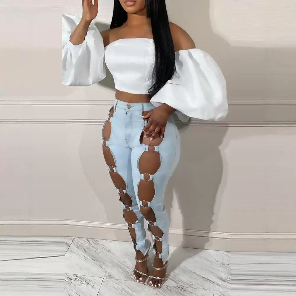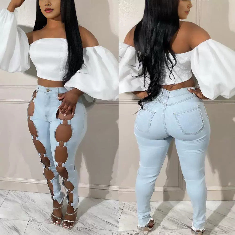 Fashion Holes Steel Ring Stitching Skinny Jeans