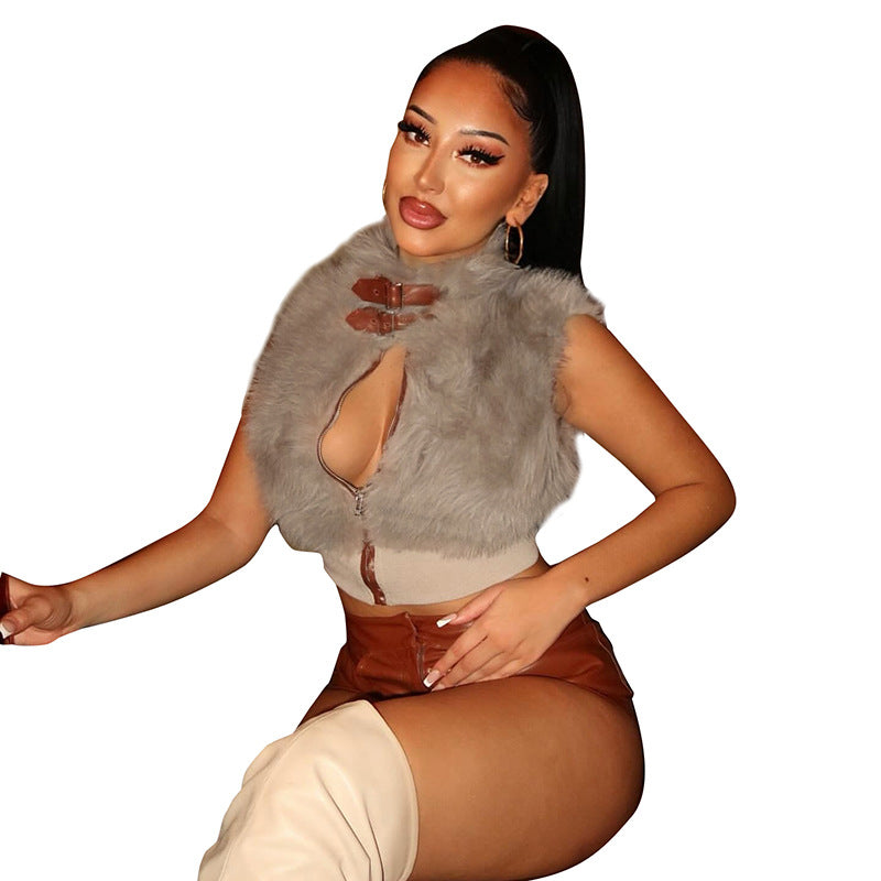 Fashion Sleeveless Plush Zipper Metal Leather Blouses