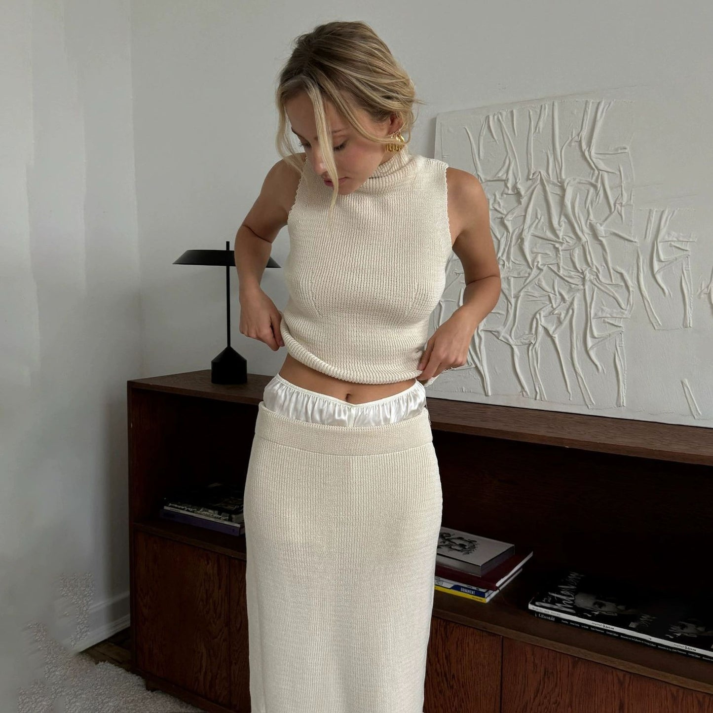 Knitted Turtleneck Green French Style Two-piece Skirts