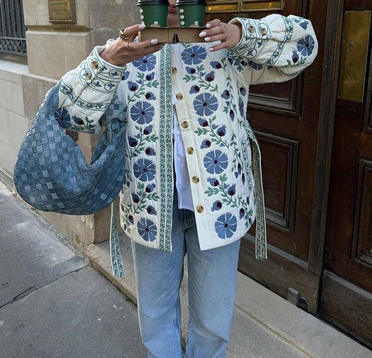 Color: Printed Lace-up Waist Trimming Coat Cotton-Padded Jacket