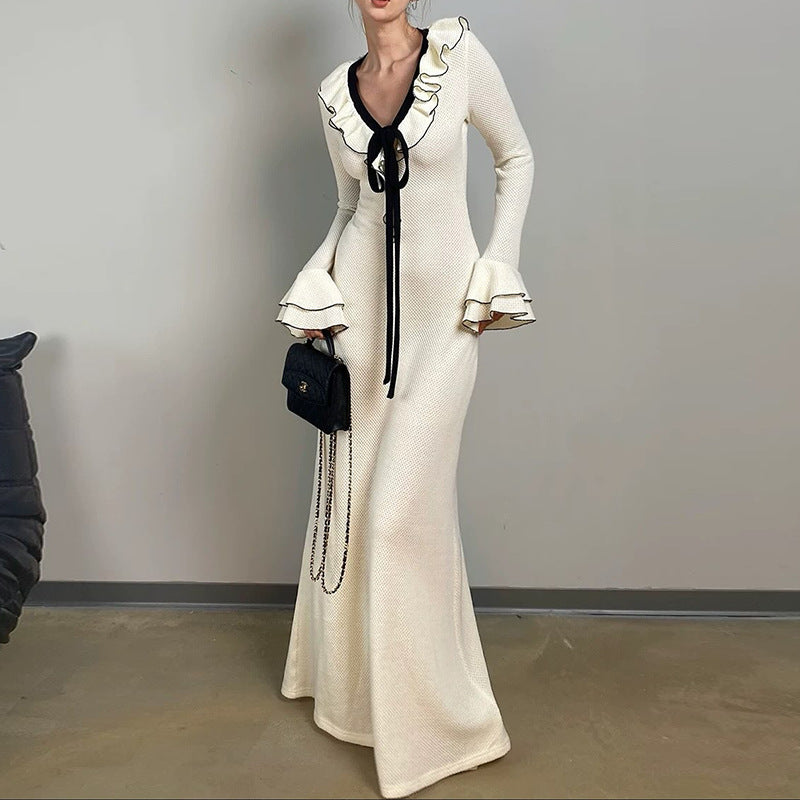 Women's Autumn Ruffled Knitted White Dress Clothing