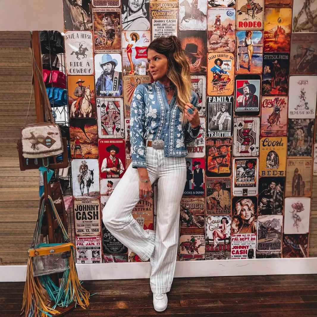 Women's Cool Embroidered Denim Buttons Long-sleeved Blouses
