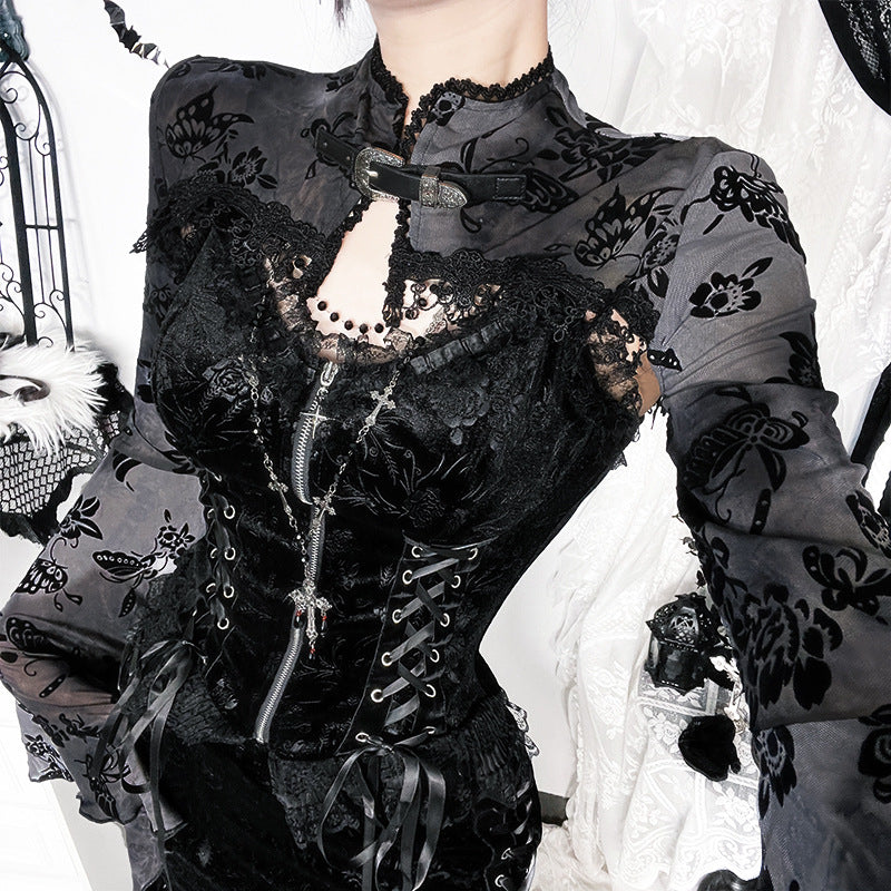 Women's Dark Gothic Style Flocking Pattern Shawl Blouses