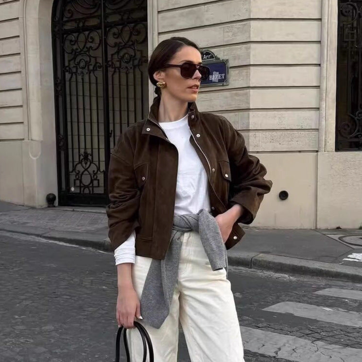 Women's Fashion Loose Zipper Ornament Stand Collar Jackets