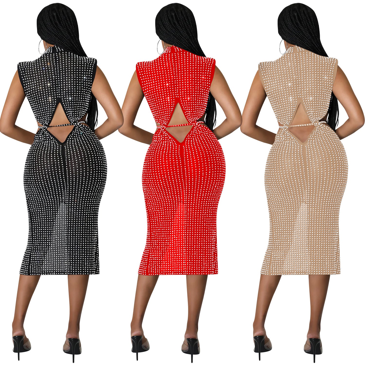 Women's Fashion Sexy Mesh Rhinestone Hollow Split Dresses