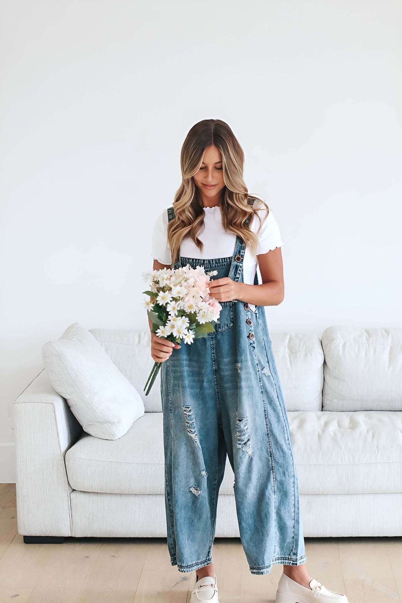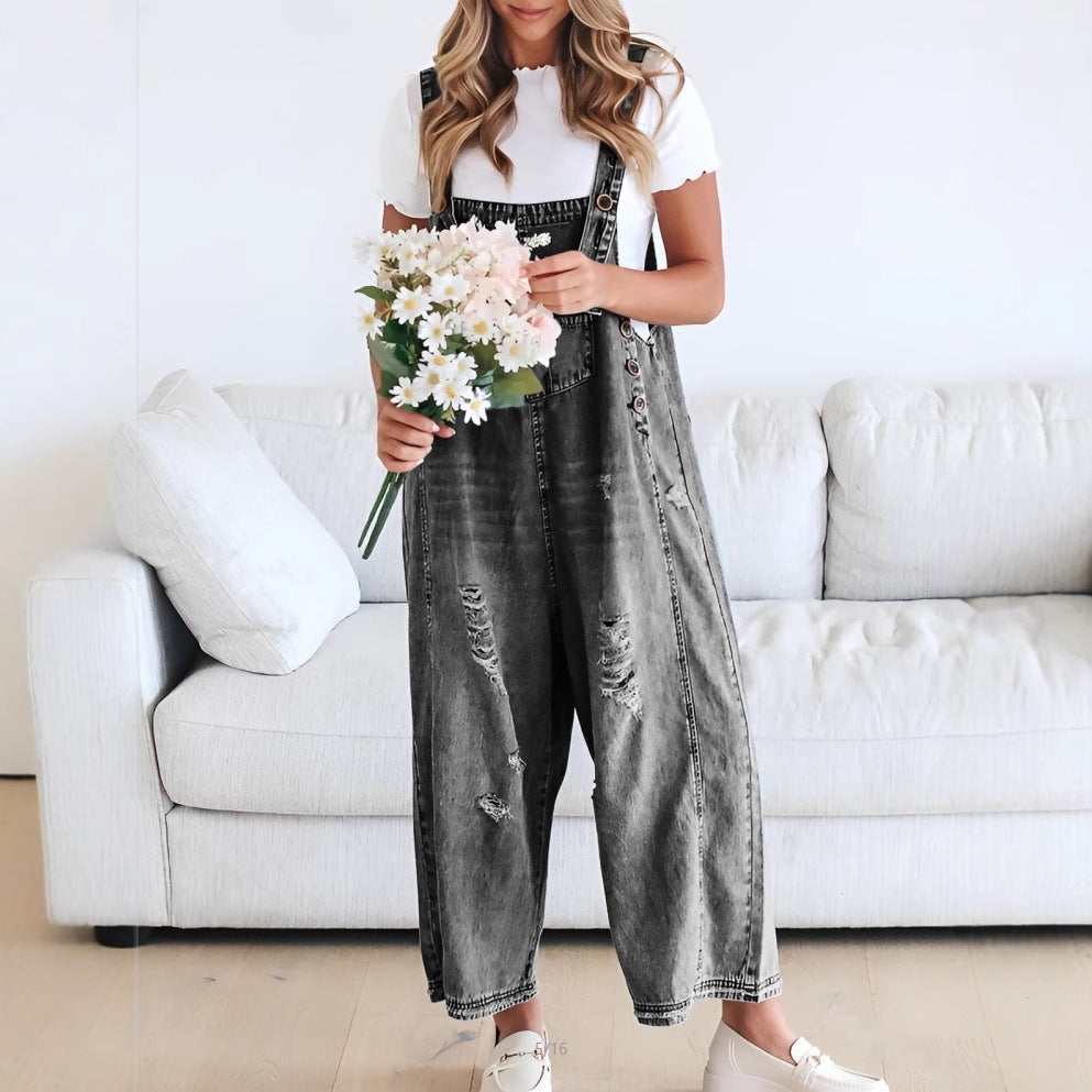 Women's Fashionable Loose Hole Casual Denim Suspender Jumpsuits