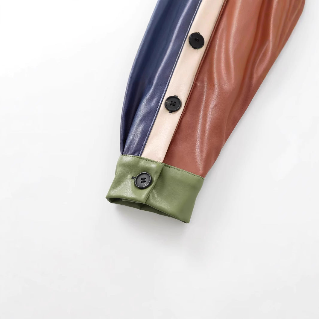 Women's French Stitching Leather Long-sleeved Lapel Contrast Jackets