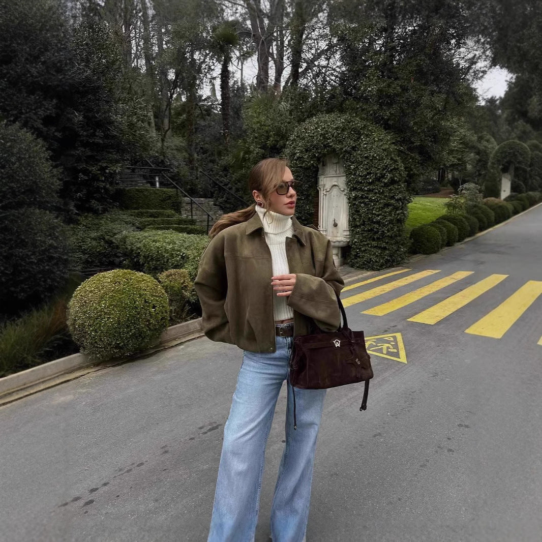 Women's French Style Vintage Zipper Lapel Elastic Coats