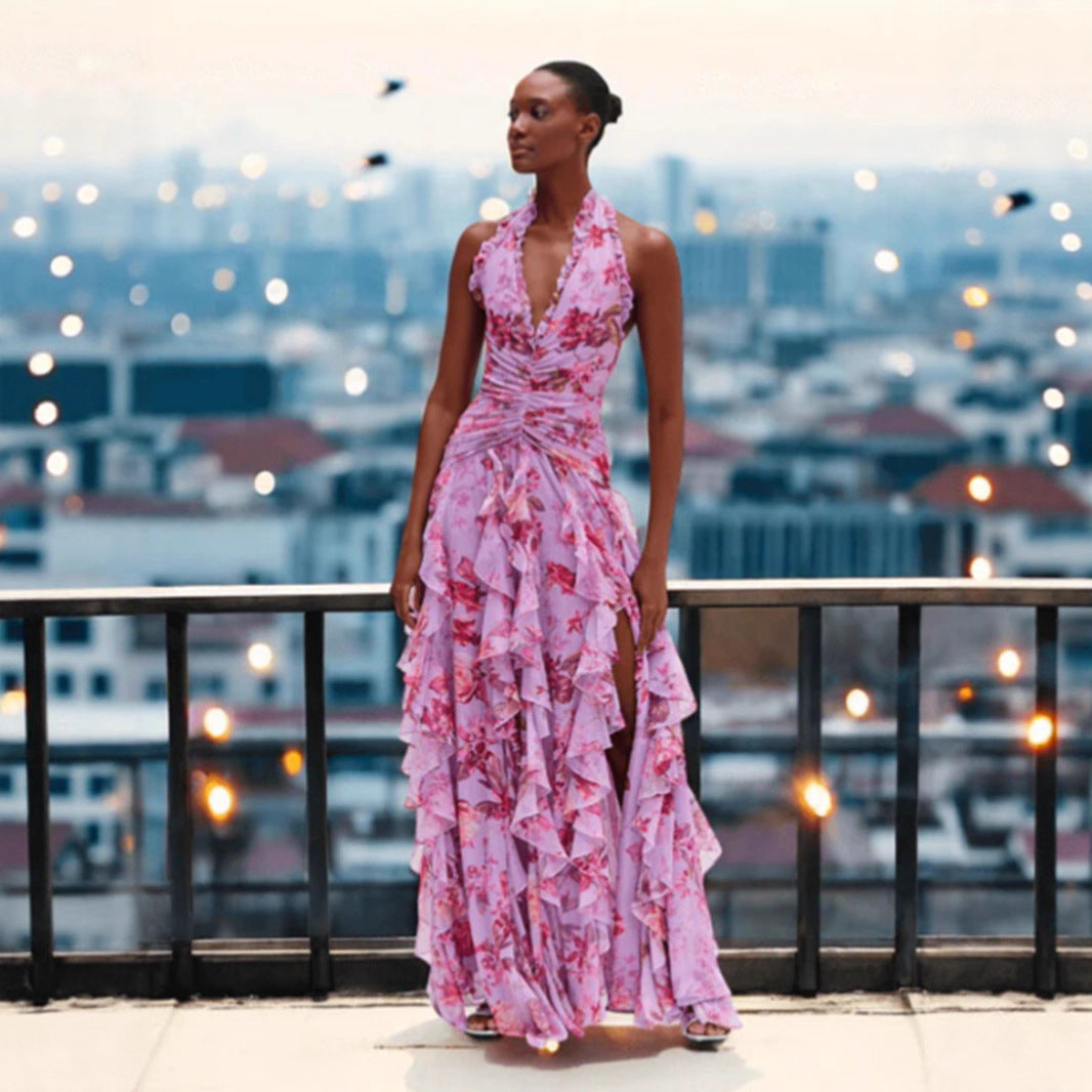 Women's Gentle Fashion Printed Pleated Waist Tight Dresses