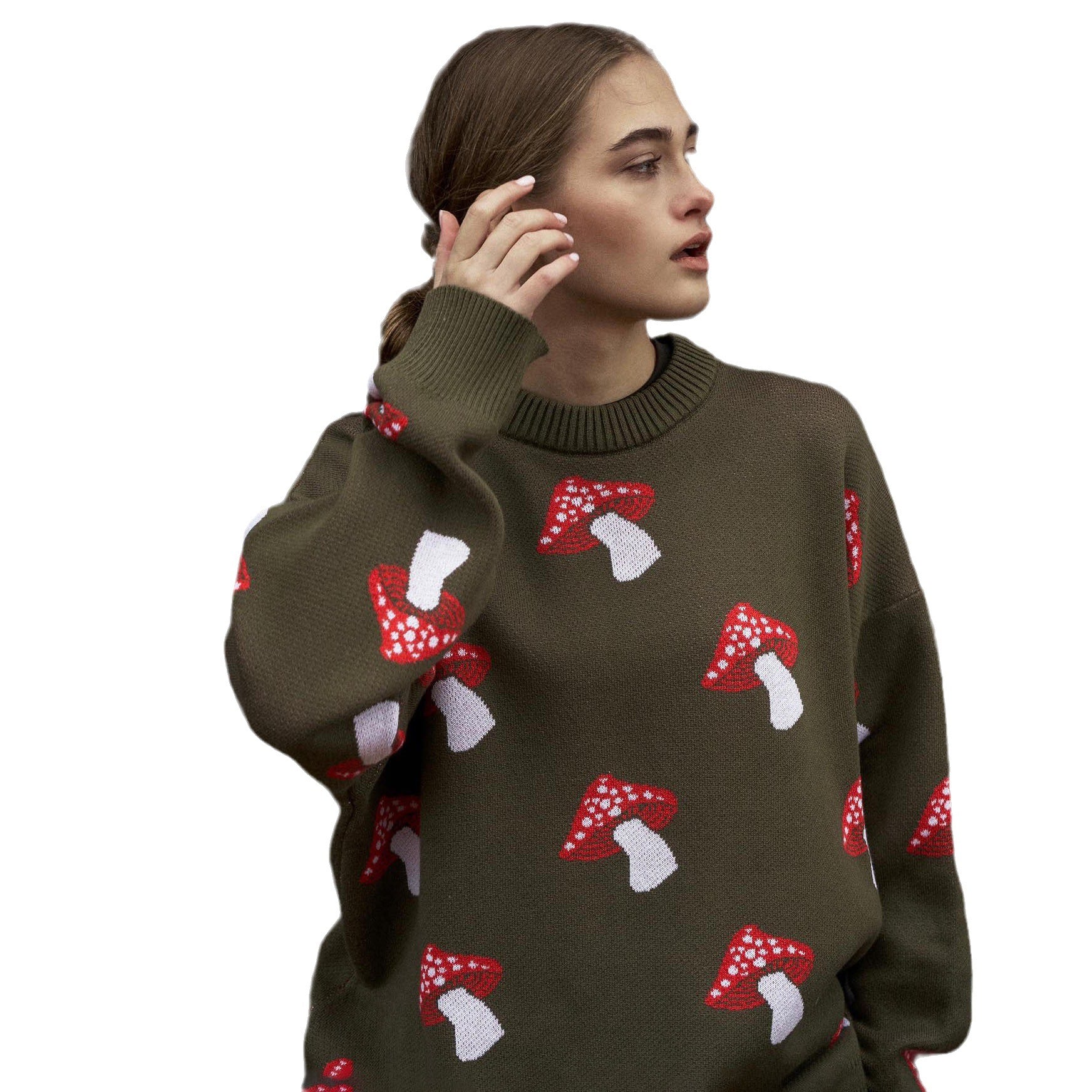 Women's Mushroom Print Contrast Color Pullover Female Sweaters