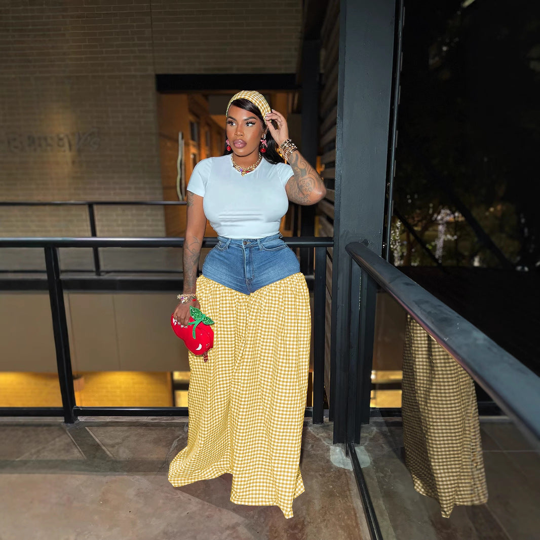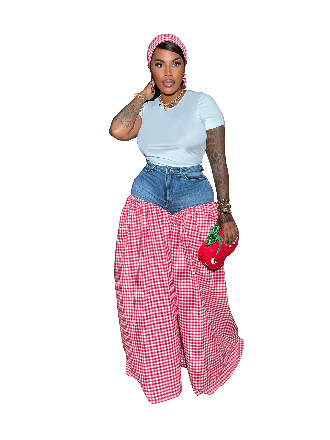 Women's Striped Denim Stitching Plaid High Waist Loose Pants