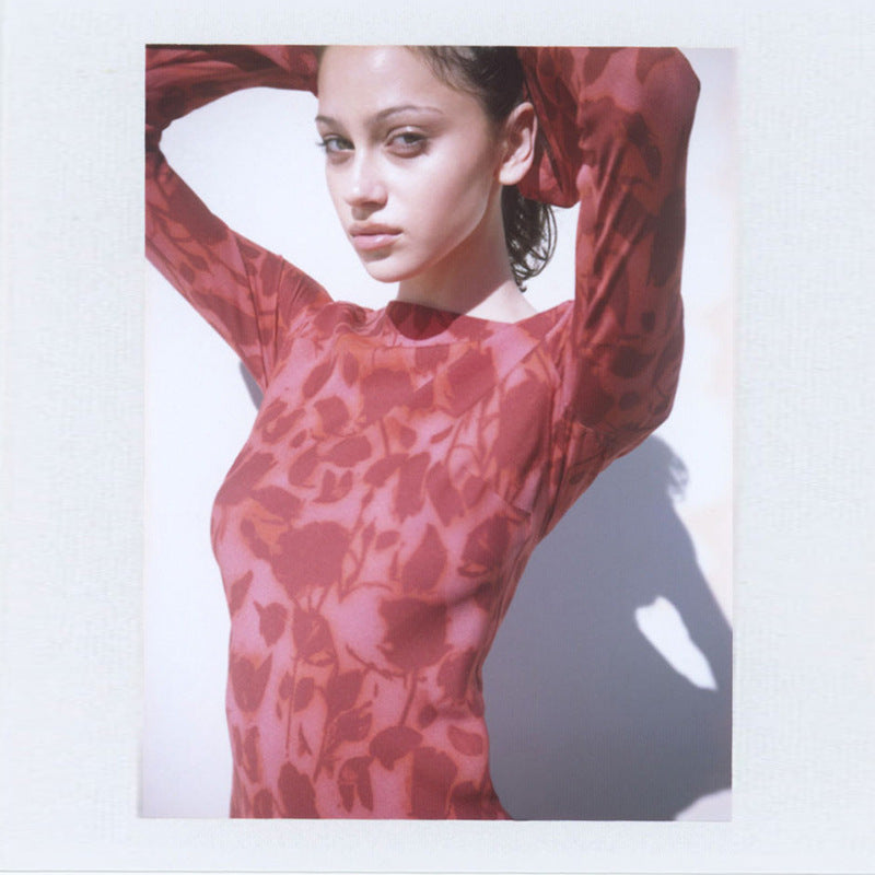 Women's Summer Red Printed Silk Blue Long Sleeve Dress Dresses