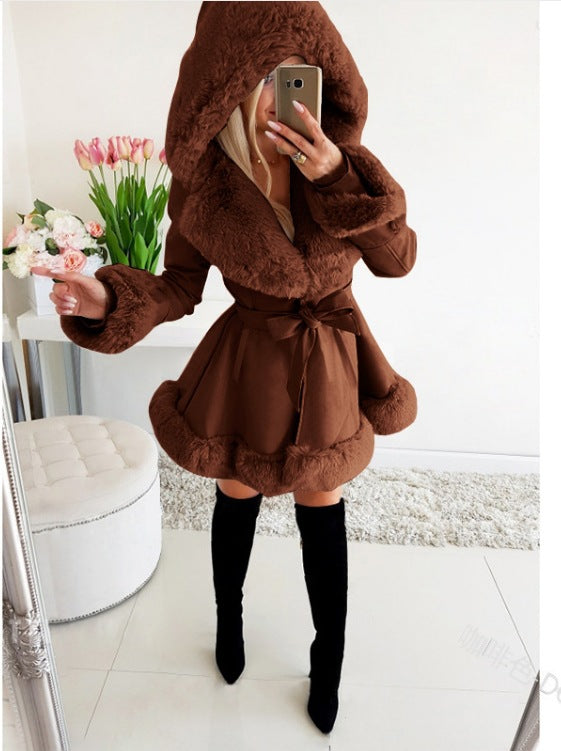 Women's Waist Trimming Winter Warm Ruffled Hooded Coats